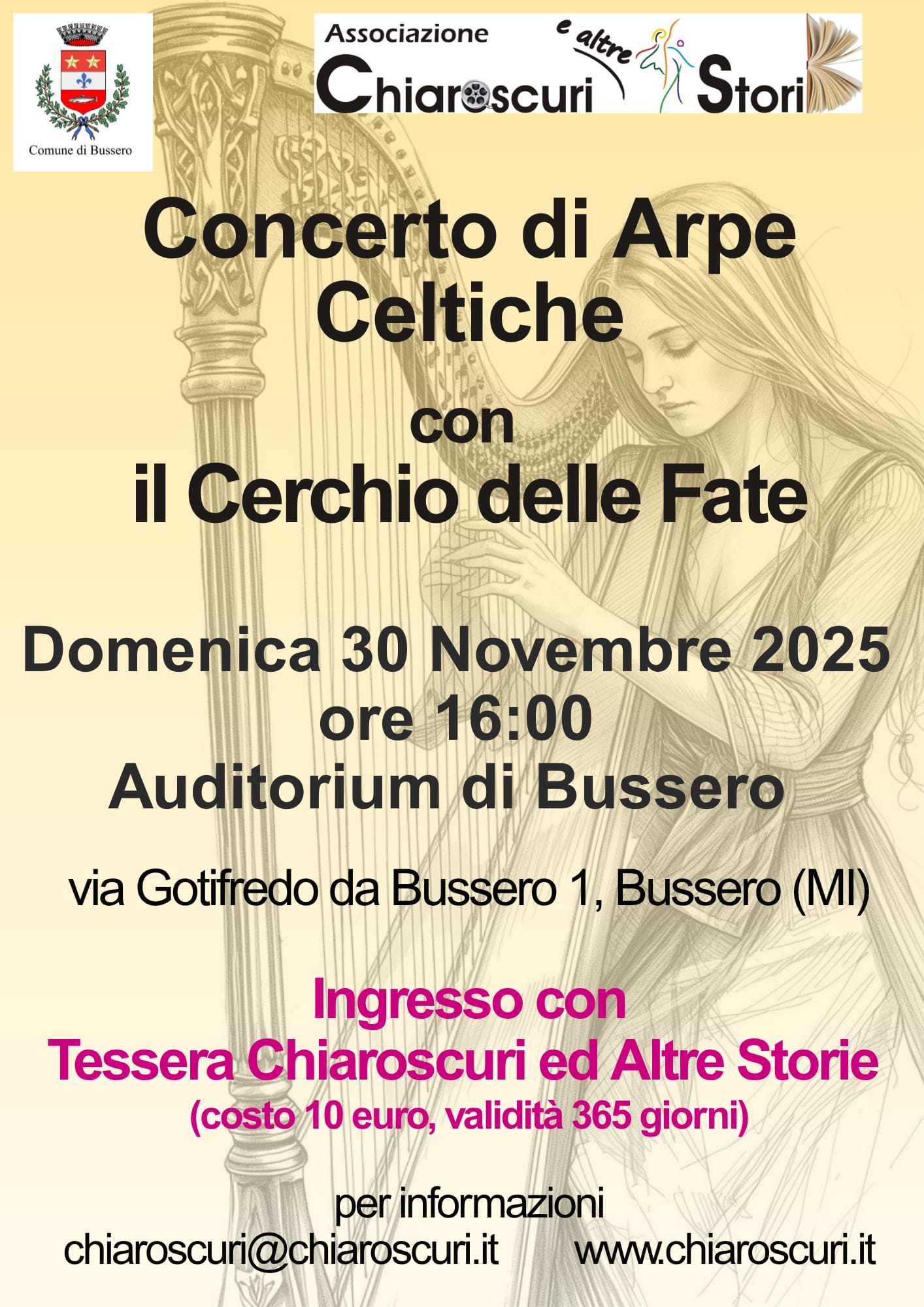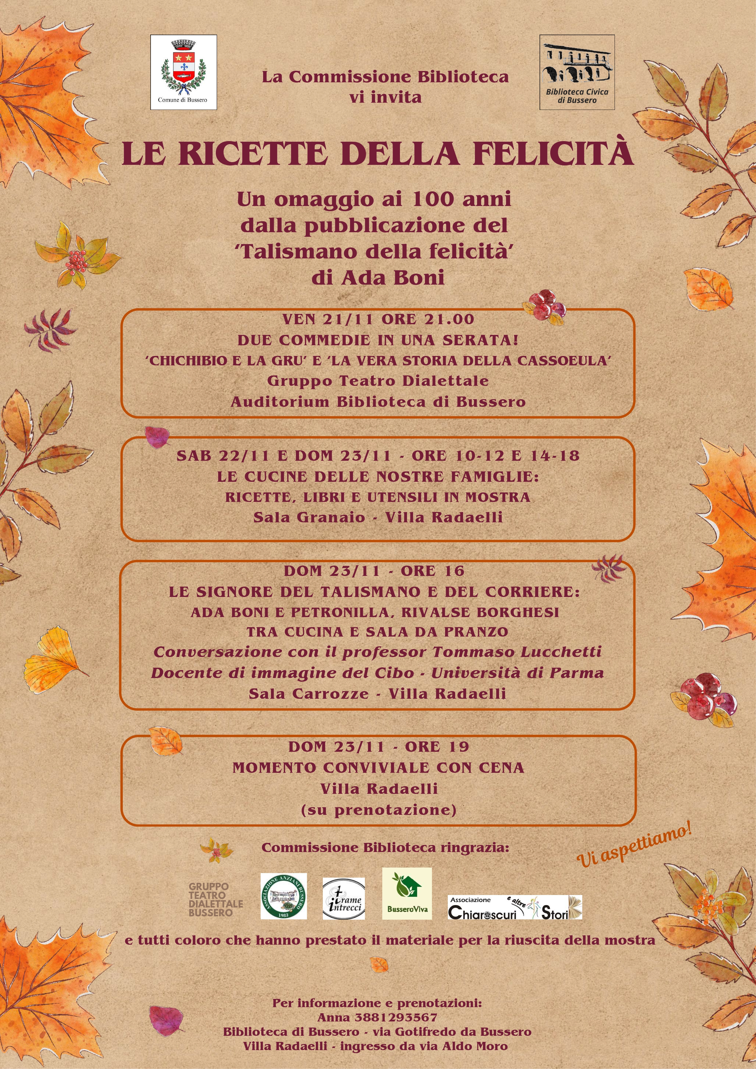 L'Associazione Chiaroscuri e Altre Storie è lieta di invitarvi al nuovo appuntamento musicale con il gruppo Il Cerchio delle Fate, che torna per il terzo anno consecutivo per regalarci un pomeriggio di magia e armonia al suono delle Arpe Celtiche. Il concerto sarà interamente dedicato al tema della donna — nella sua forza, nelle sue sfumature, nella sua ispirazione — interpretato attraverso il romantico e suggestivo linguaggio dell’arpa celtica ![]() Con piacere segnaliamo una tre giorni di appuntamenti per celebrare i cento anni dalla pubblicazione del " Talismano della Felicità" di Ada Boni. Organizzata dalla Commissione Biblioteca con il contributo di alcune Associazioni busseresi tra cui ChiaroScuri & Altre Storie Ingresso libero alle tre serate